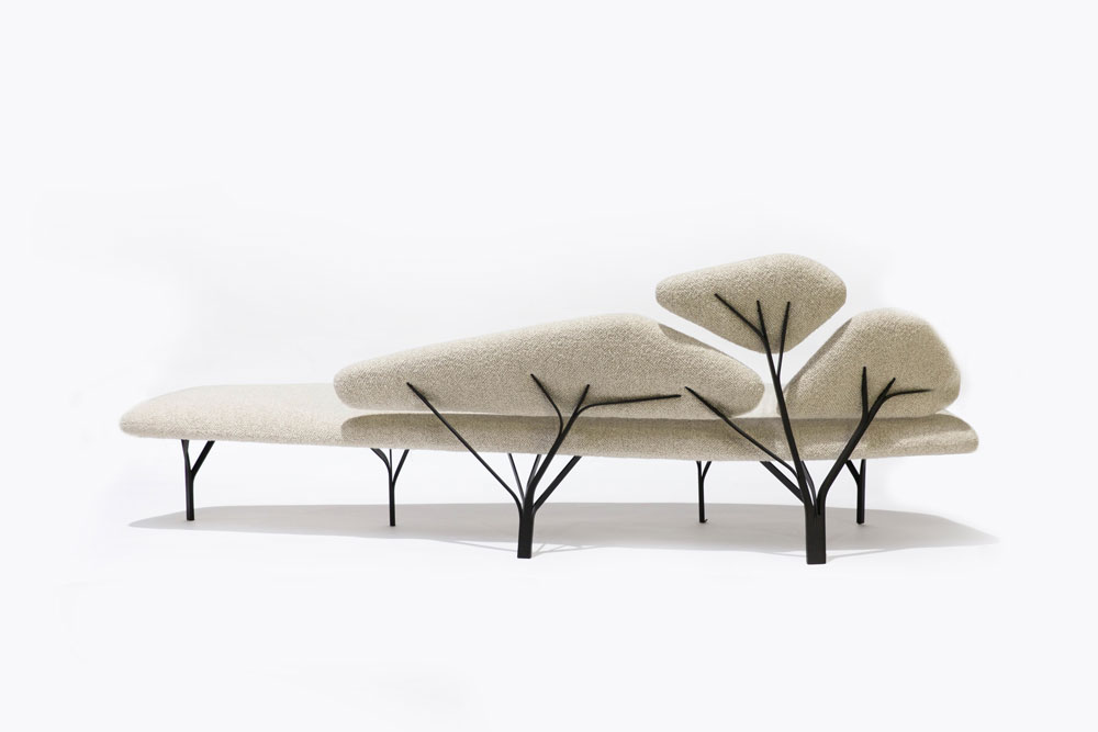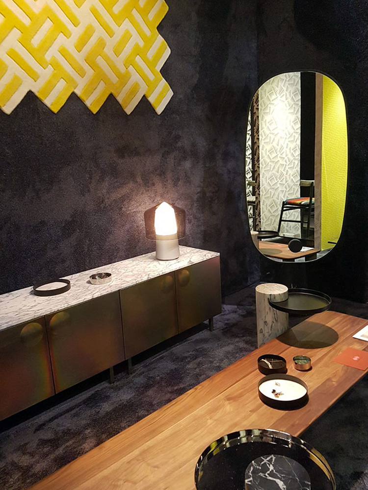 Let’s also discover new finitions of our iconic pieces : a high Salute table by Sebastian Herkner made with a red marble and a long Borghese sofa by Noé Duchaufour Lawrance with a Pierre Frey fabric.