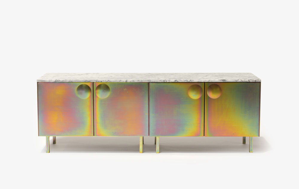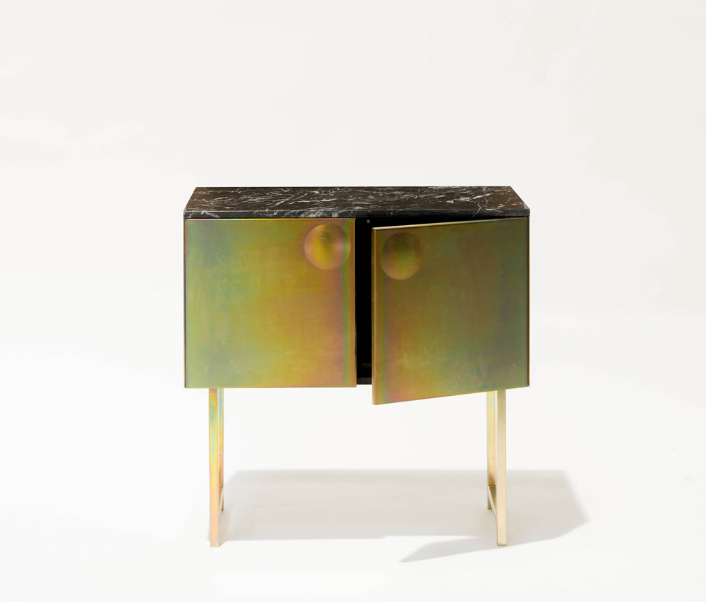 Bump is a collection of cabinets in galvanized steel and marble. The name comes from the ‘Bump’ on each door where you push to open the doors. Galvanization is a process traditionally associated with heavy industry and used to protect metals against corrosive substances. Steel is submerged in a bath of protective molten yellow zinc which creates this unique iridescent colour and shades. A Bump prototype was first presented at Spazio Roanna Orlandi in Milan 2016 by Czech Designers Jan Plechac & Henry Wielgus. This piece was the base concept for a 2 years work between La Chance and the designers to develop the Bump collection of credenza and cabinets.