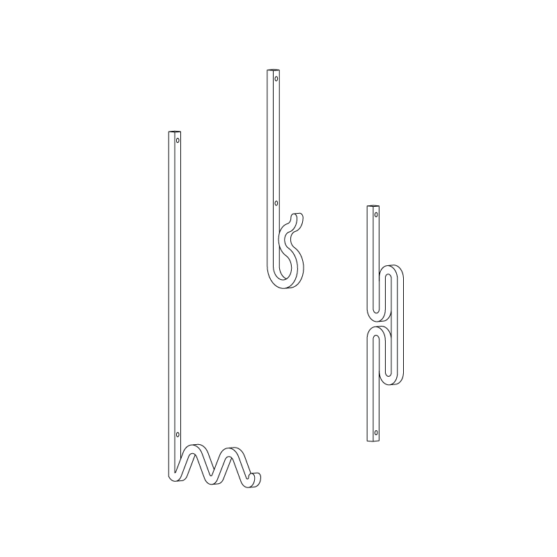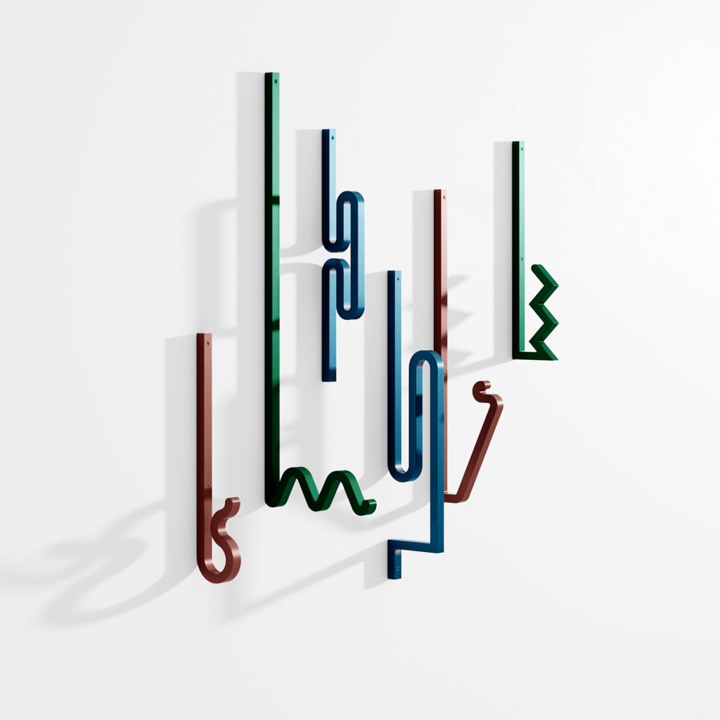 Zag is a family of coat hooks. Their varied shapes are inspired by barrettes, pins, or twisted metal rods combined to create a graphic composition. Each element offers a different way to hang your clothes, your bag, or any accessory. The modern ‘sans serif’ fonts simple and strong shapes were used by Bling studio to create these metal shapes. The lines intersect and combine to create graphic shadows on your wall. You can create your own sculptural composition by combining the Zag elements. 3 sets of 2 Zag hooks are available with different colors. You can combine them for a visually infinite number of compositions.