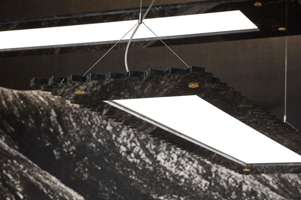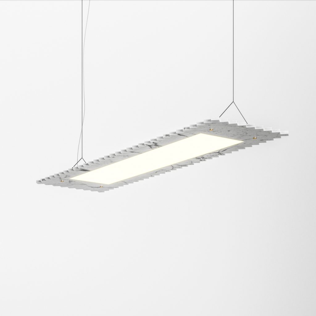 The Fax pendant lamp is a large marble pendant light. The flat LED dimable source is surrounded by a thin slab of marble (white, green, or black) held by four brass bolts with gilloche pattern. The 3 shapes (rectangle, oblong, or ‘stamp edge’) allow to create numerous compositions. The overall thickness is only 3cm.