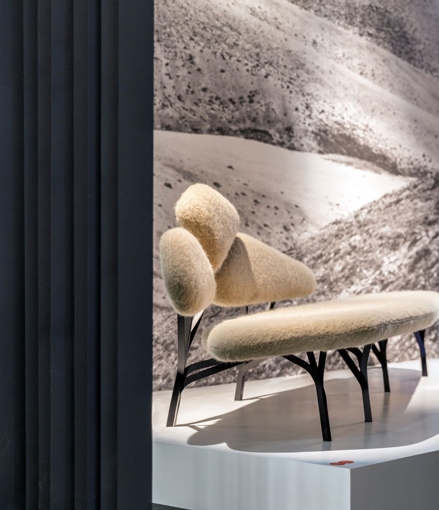 Block is a lounge armchair inspired by the Brutalist architectural movement. Two massive blocks of walnut which are the structure and the armrests, give the armchair its singular silhouette. This geometric identity is balanced by the lightness and comfort of the seat upholstered in a Bouclette fabric or a luxurious sheepskin.