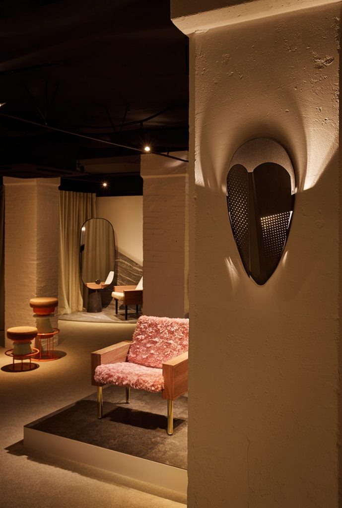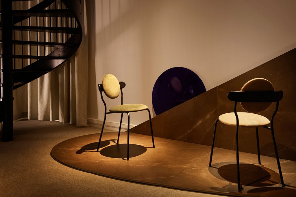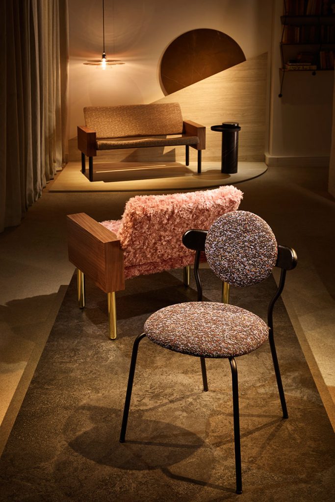 The Block lounge chair by Jonas Lutz and the Planet chair by Jean-Baptiste Souletie were presented in various fabrics and finishes, ranging from very quiet velvets and bouclettes in muted tones to the colorful and textured Raf Simons by Kvadrat latest creations Atom and Argos.